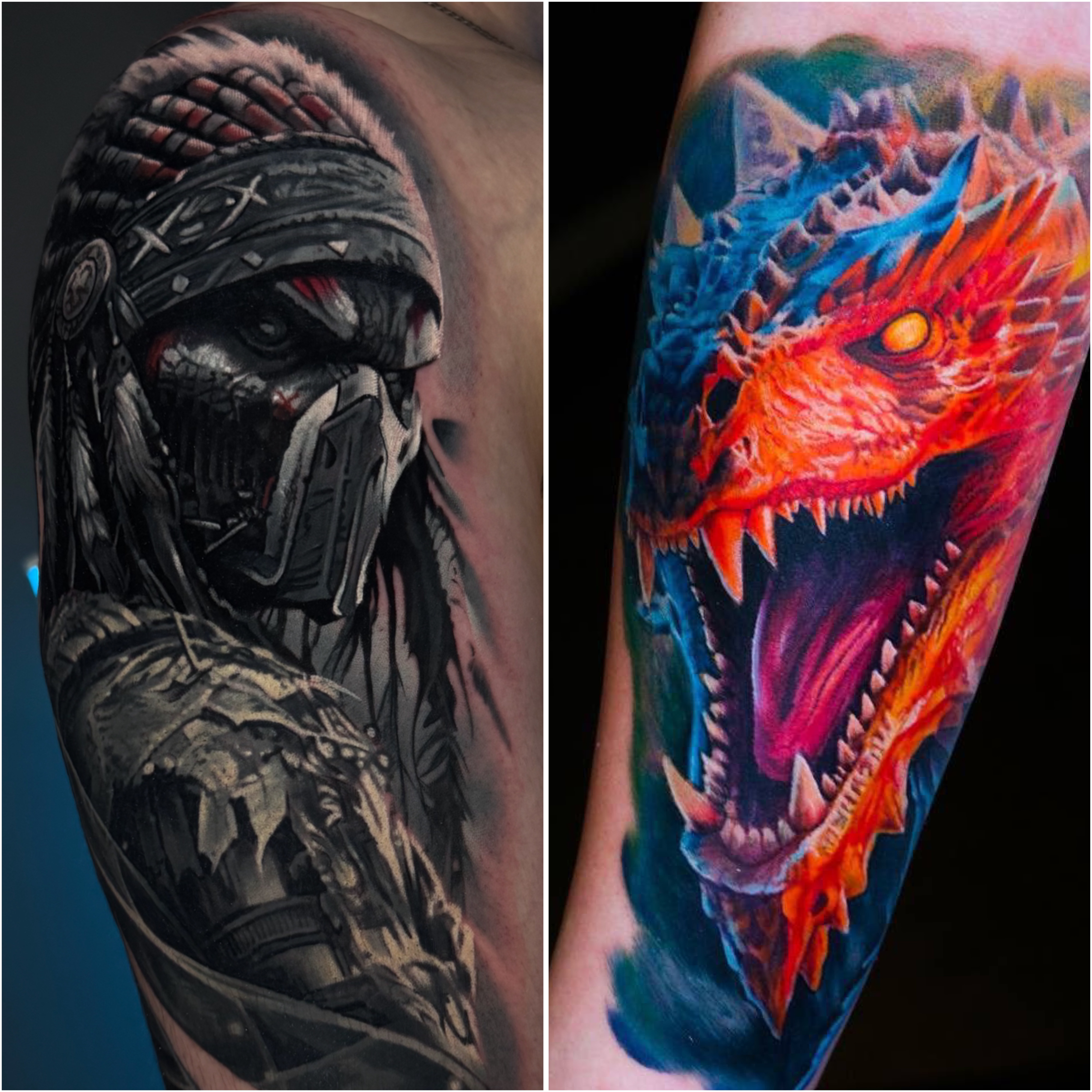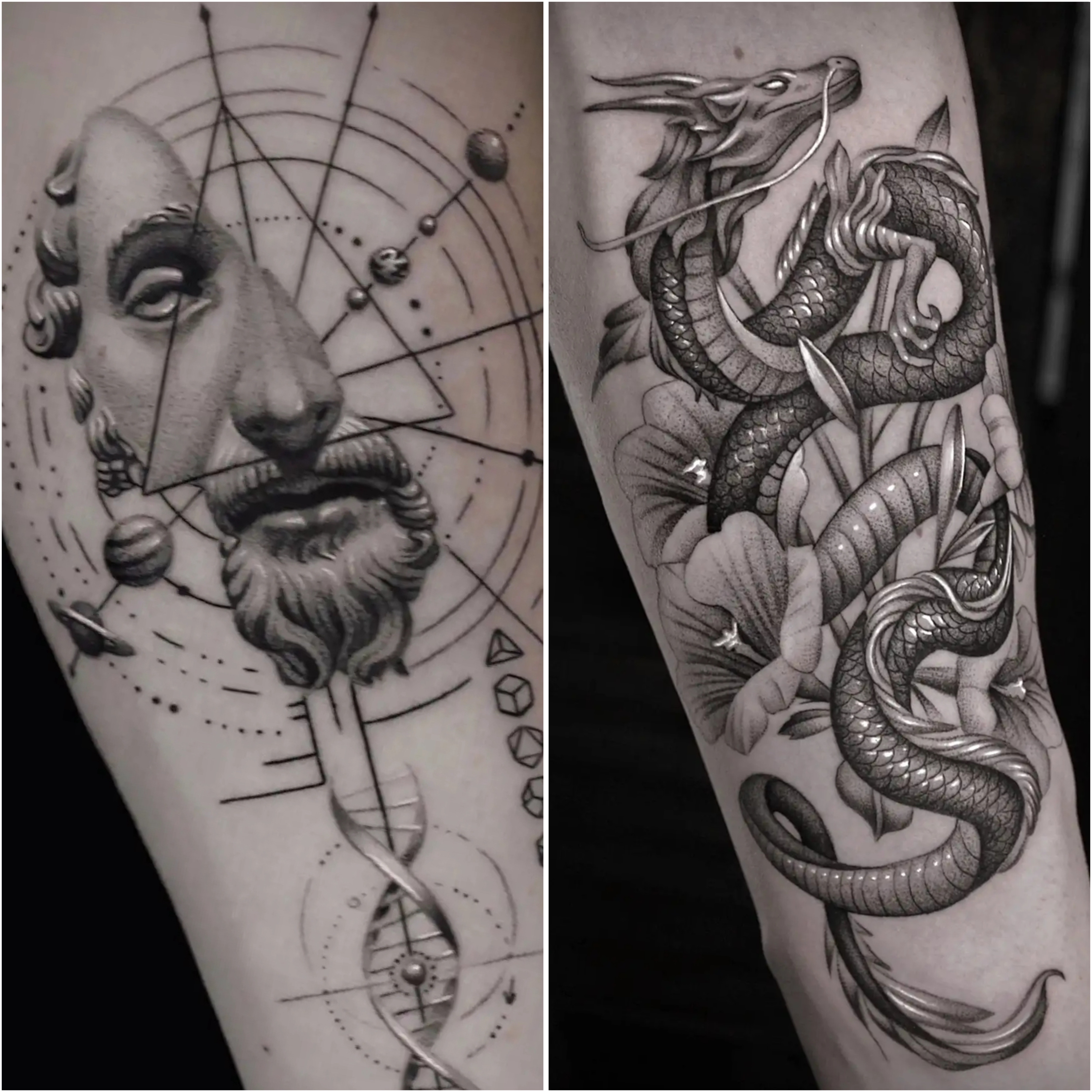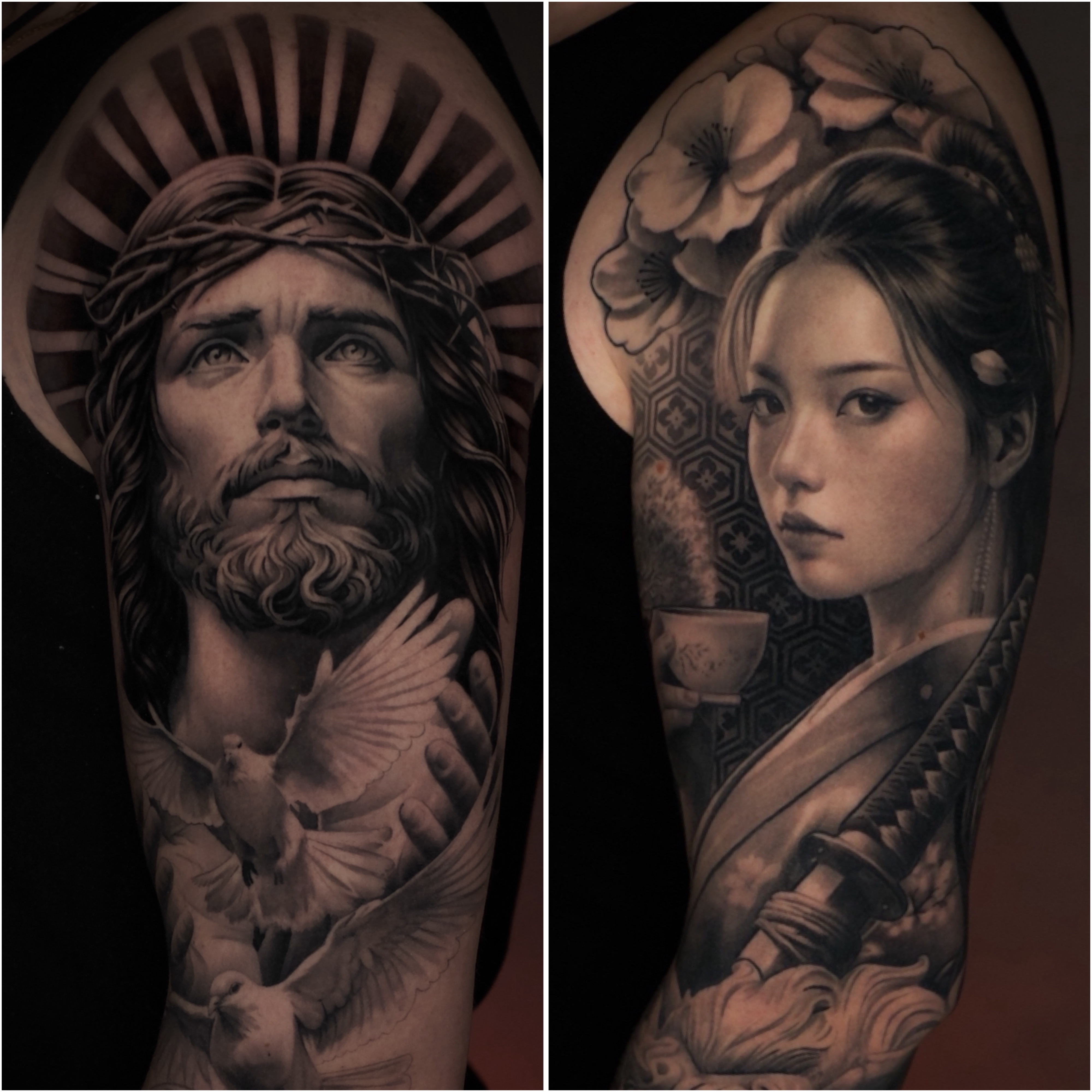 · Японский (Japanese / Irezumi): Масштабные сюжетные композиции (драконы, карпы, гейши, самураи) с традиционным фоном.